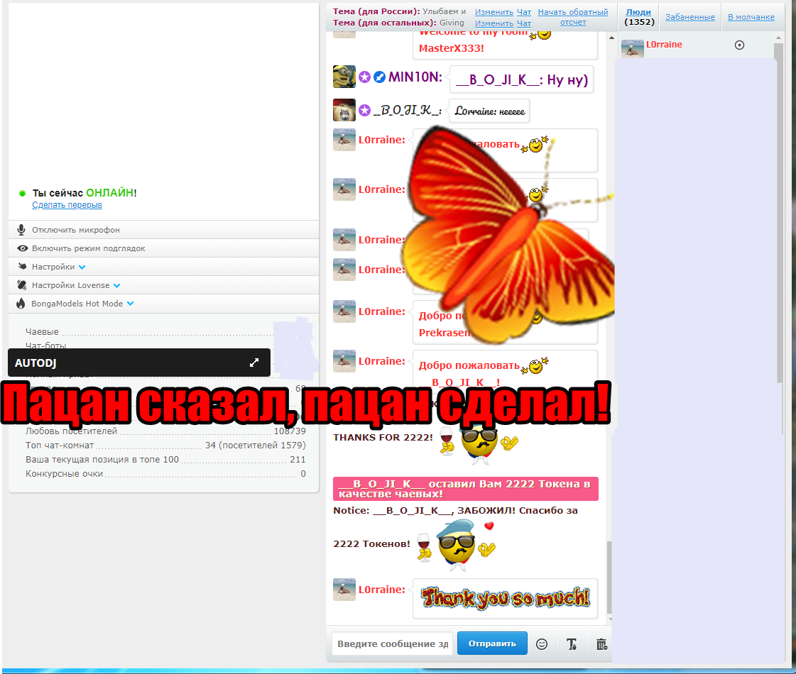 Genom att klicka på knappen kommer dy flytta L0rraine till första plats på huvudsidan i 60 sekunder. Under denna tid kommer modellens chattrum att bli synligare och otroligt populärt! En notifikation om din åtgärd kommer synas i chatten och är synligt för modellen och övriga chattanvändare. L0rraine kommer garanterat uppskatta denna gest och bli oerhört tacksam till dig!